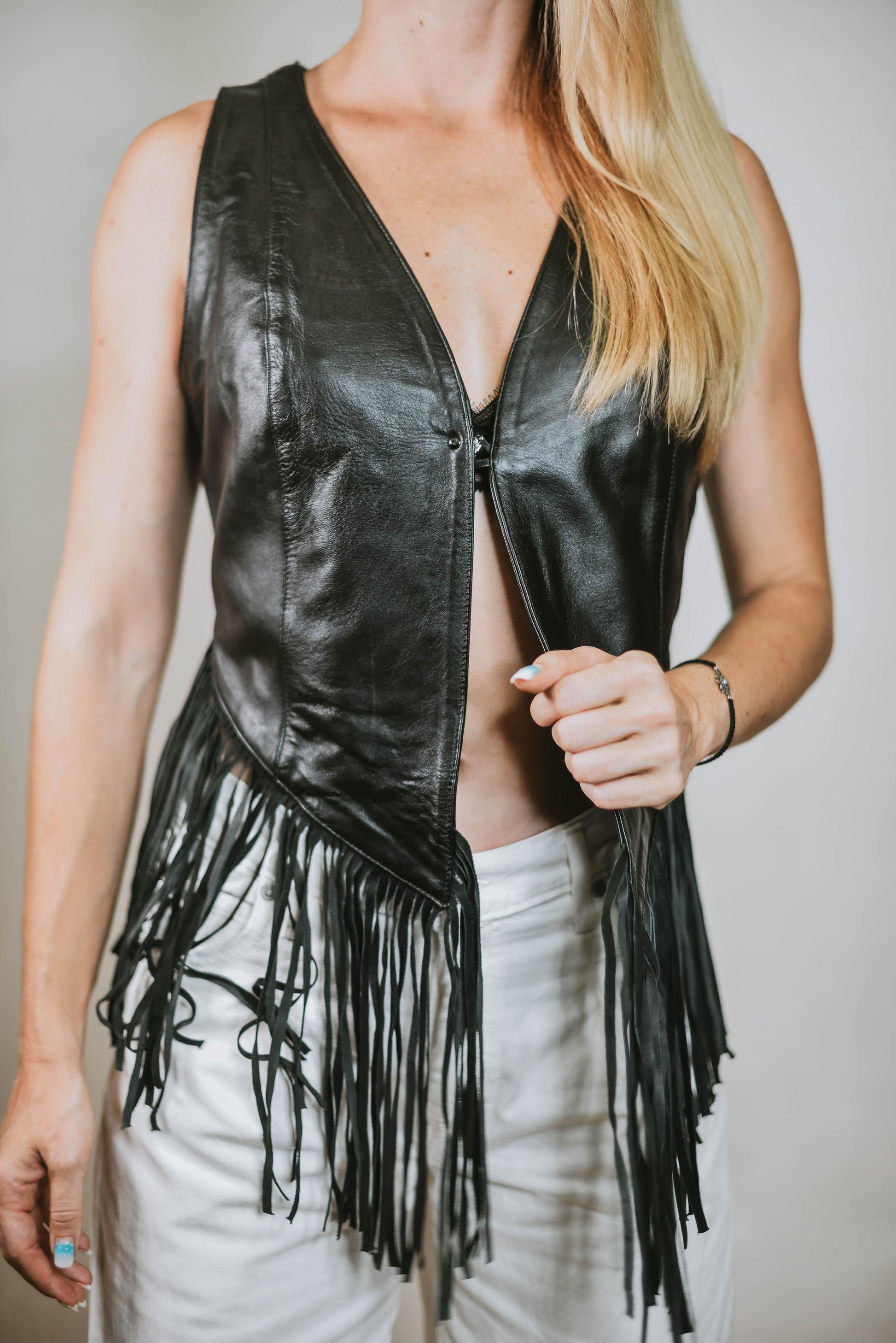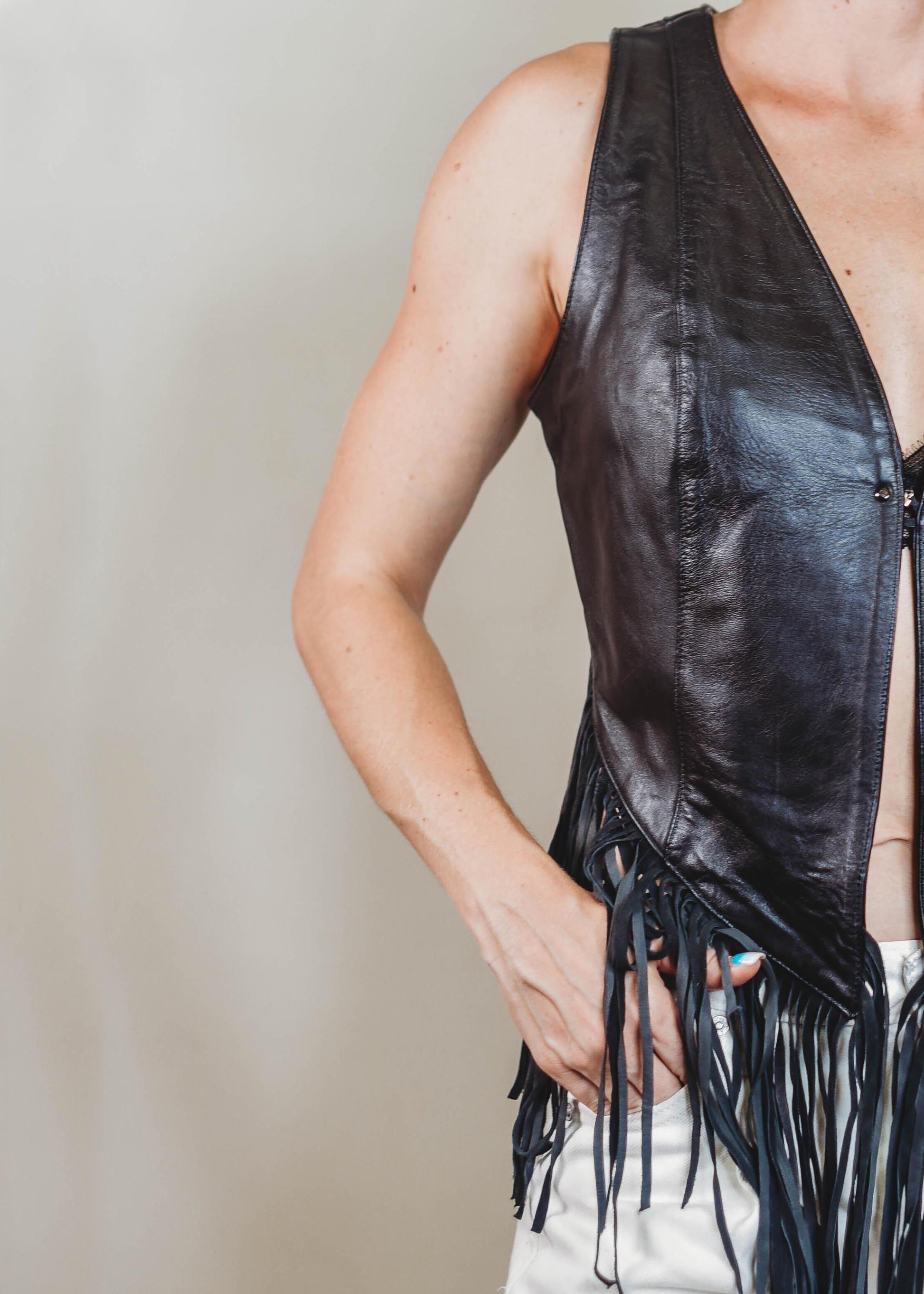 Elevate your wardrobe with our exquisitely crafted V-neck vest, made from the finest 100% lamb napa leather. Embodying timeless Western charm, this piece features delicate fringes that add movement and a touch of rugged elegance. Designed to exude sophistication and bold femininity, it seamlessly combines luxurious craftsmanship with a distinctive bohemian allure. Perfect for confident women who embrace their individuality, this vest transforms any ensemble into a statement of style and grace.